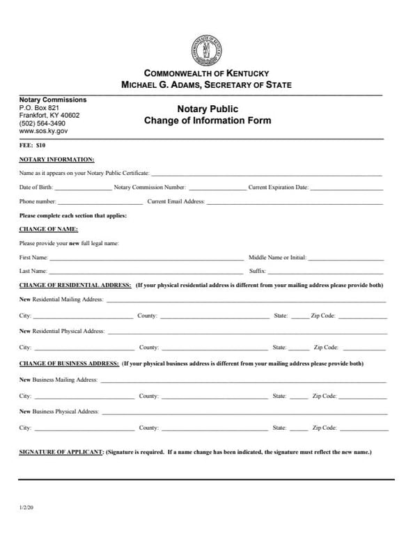 Lexington, Kentucky Notary Public Change of Information Form PDF File