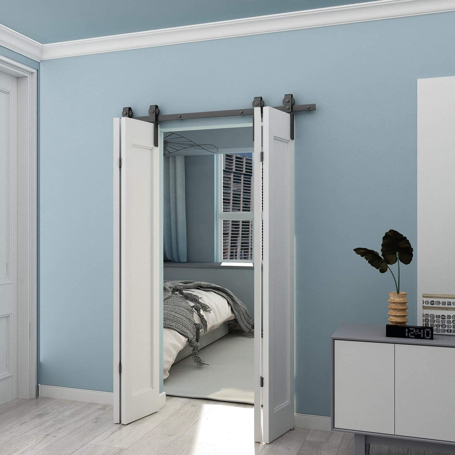 JUBEST Matte Black Steel Bifolding Standard Double Door Barn Door