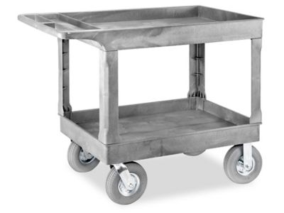 Uline Utility Cart with Pneumatic Wheels 45 x 25 x 37", Gray H2505GR Shelf Cart Uline Ready for duty in offices, stockrooms and warehouses. Top shelf doubles as a work surface. Shelves are 12in apart and 1/4in deep. Recommended for small warehouses or retail stockrooms. Load and unload oversized items easily. Uline stocks over 42,000 shipping boxes, packing materials, warehouse supplies, material handling and more. We deliver to your care setting. Lightweight, quiet and easy to. Shelf Cart Uline.