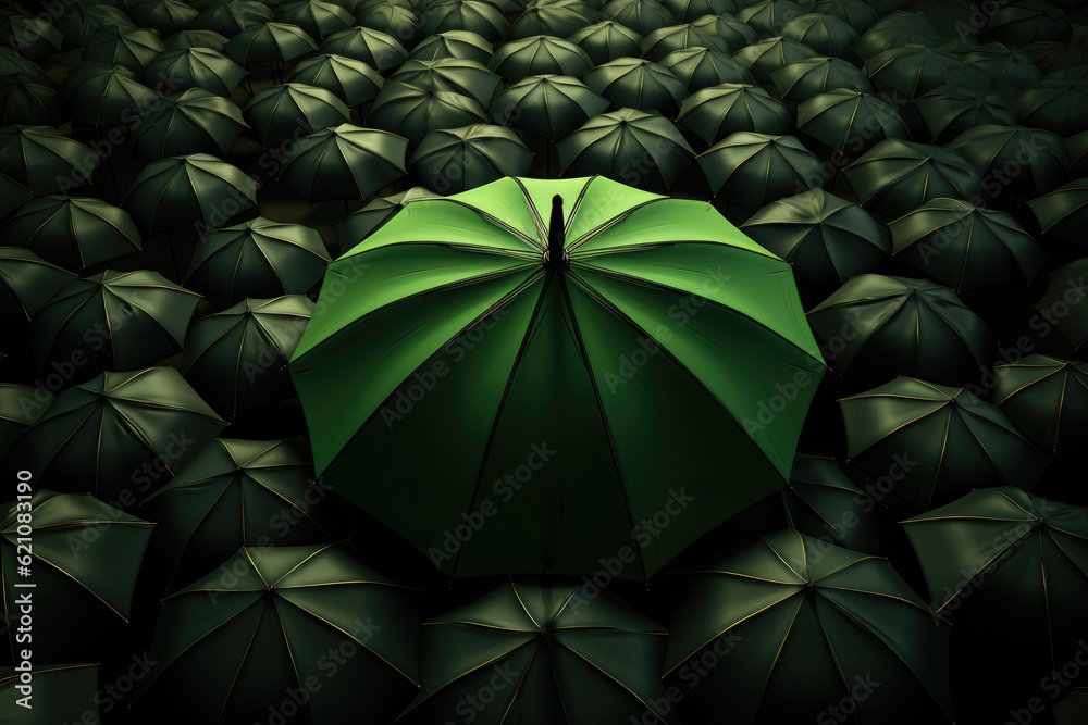 Depicting a green umbrella standing out from a crowd of black umbrellas, symbolizing the concept