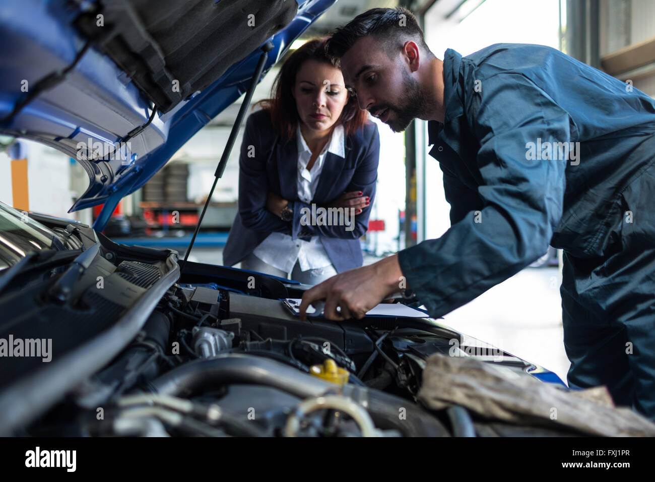 Mechanic showing customer the problem with car Stock Photo Alamy
