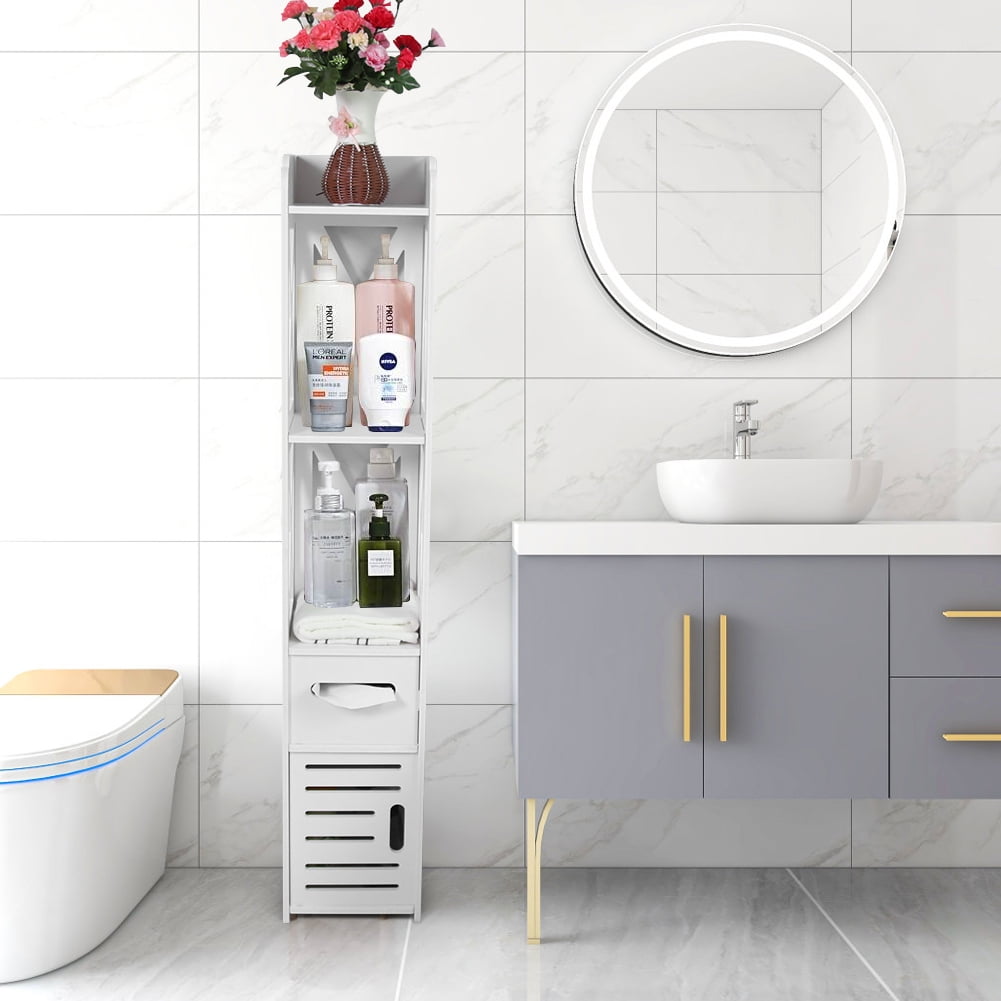 Small Bathroom Storage Corner Floor with Doors and Shelves, Thin Toilet Vanity Small Bathroom Storage Corner Floor Cabinet With the unique triangle design, the floor cabinet allows you to utilize an empty corner to maximize storage space. This is a reliable, slim bathroom storage cabinet you can trust! Measuring 15.7d x 7.1w x 52.9h, it is designed to fit perfectly in small spaces or. Shop bathroom storage and a variety of bathroom products online at. [perfect for tight. Small Bathroom Storage Corner Floor Cabinet.