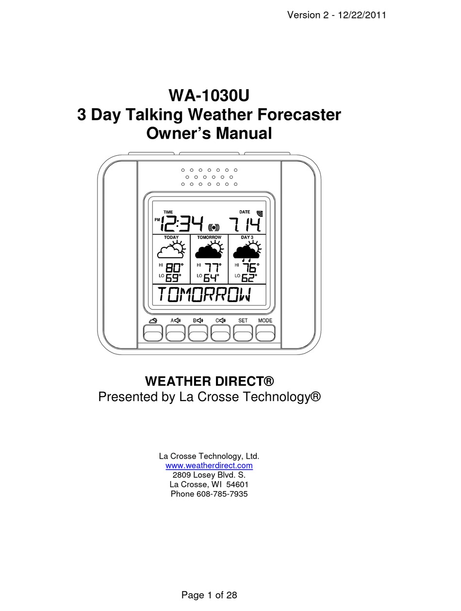 LA CROSSE TECHNOLOGY WEATHER DIRECT WA1030U OWNER'S MANUAL Pdf