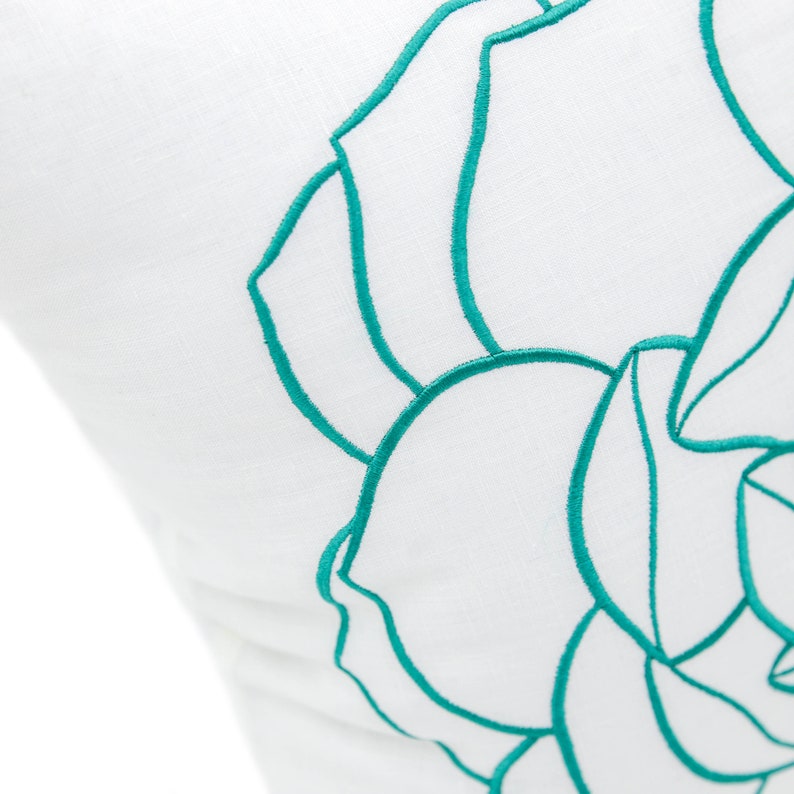 Rose Pillow Cover White Linen Turquoise Flower Embroidery Etsy