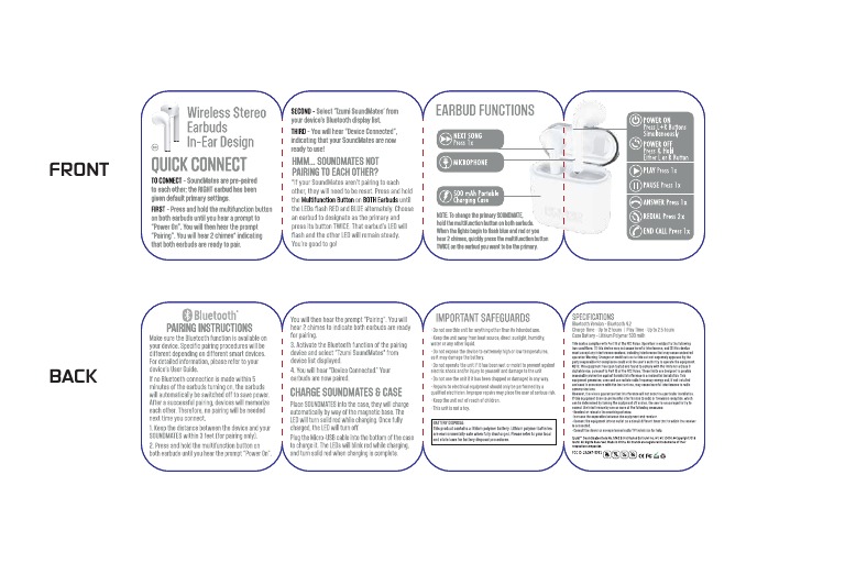 Tzumi Soundmates Wireless Stereo in Ear Earbuds Manual Original PDF