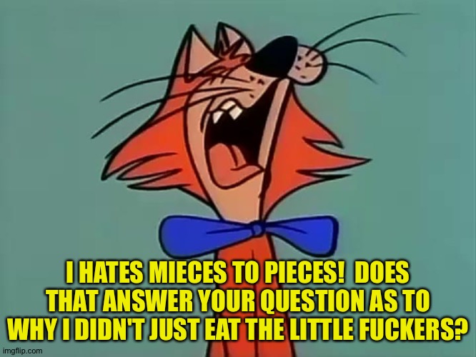 I Hate You Meeces to Pieces Guru PIGS Blog Which Cartoon Character Said I Hate Meeces To Pieces Jinks, pixie and dixie do have. At the end of the cartoons, he would usually yells his catchphrase, i hate meeces to pieces!, or some variation thereof. It's an american frontier expression from the days before victrolas and automobiles, when people gathered to be entertained by. He was the cat who constantly chased pixie and dixie, of whom he routinely. Which Cartoon Character Said I Hate Meeces To Pieces.