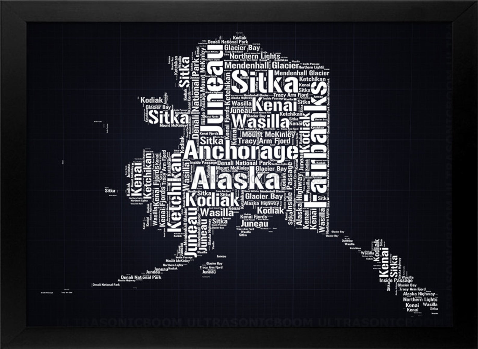 Alaska map print Word Art Typography Cities and Places Navy Etsy