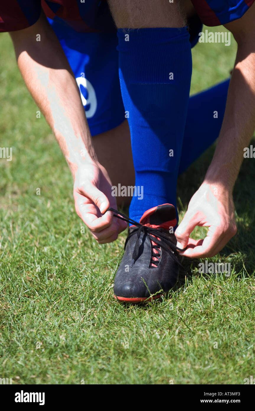 Soccer player tying boot laces Stock Photo Alamy
