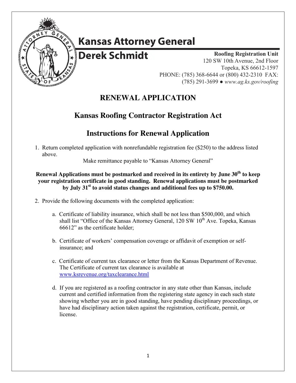 Kansas Renewal Application for Roofing Contractor Registration Fill