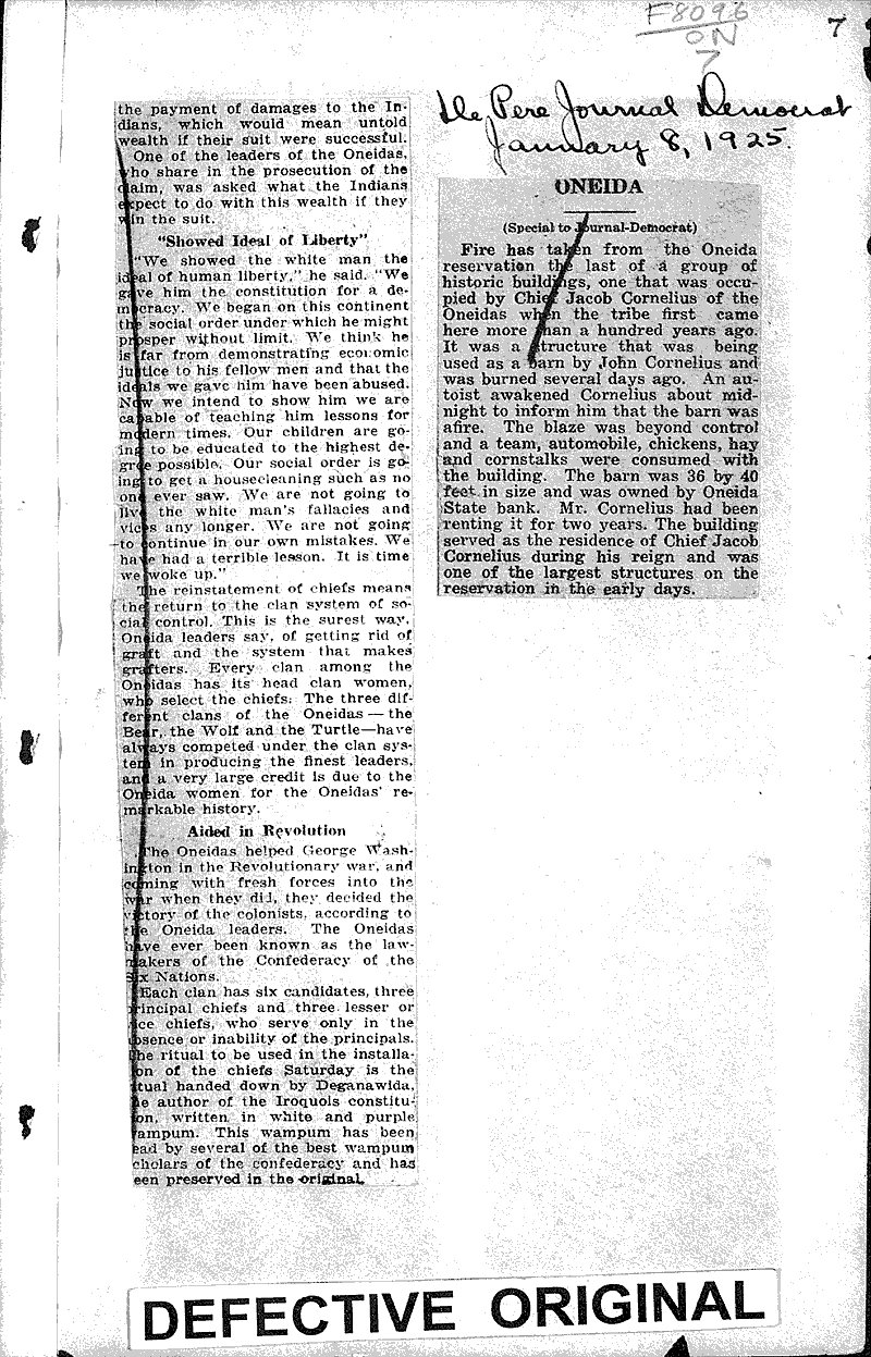 Oneida Newspaper Article/Clipping Wisconsin Historical Society