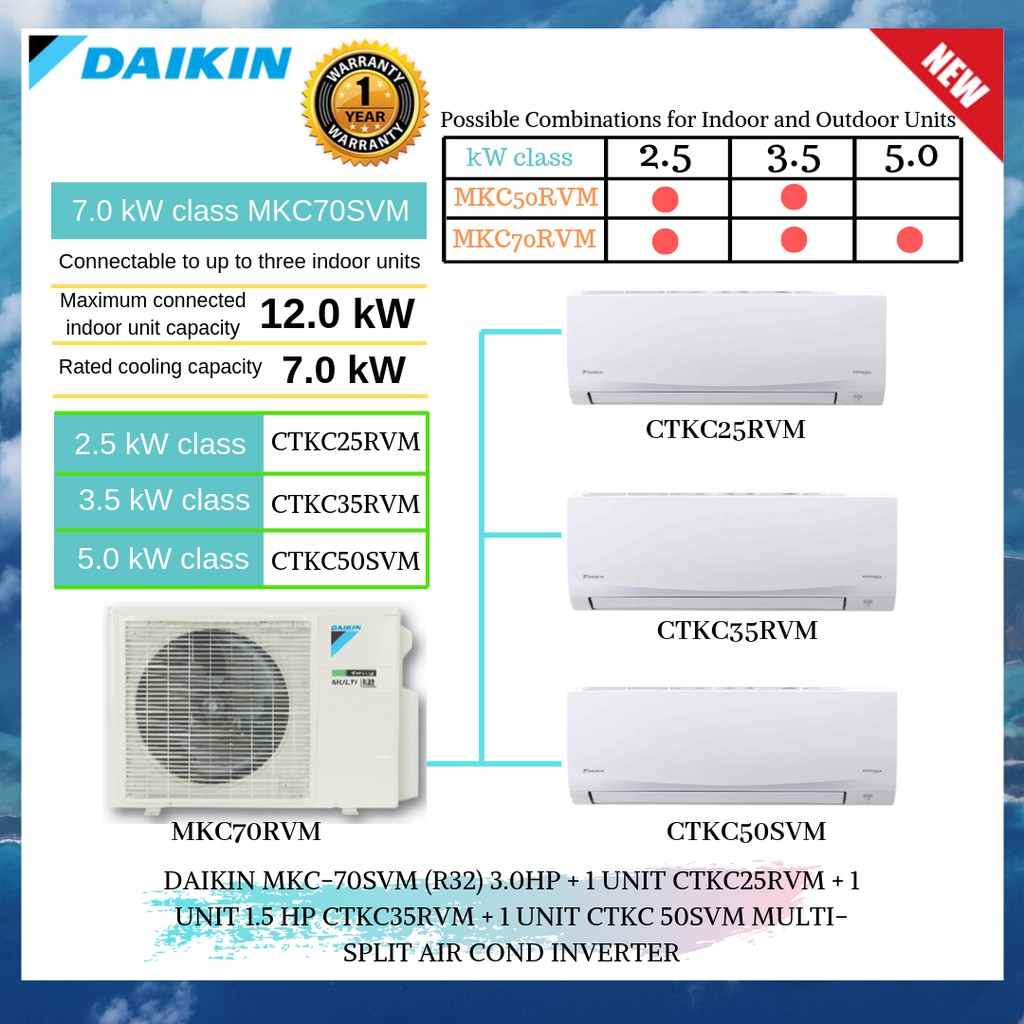 DAIKIN MULTISPLIT AIR COND INVERTER MKC70SVM 3.0HP + 1 UNIT 1.0 HP