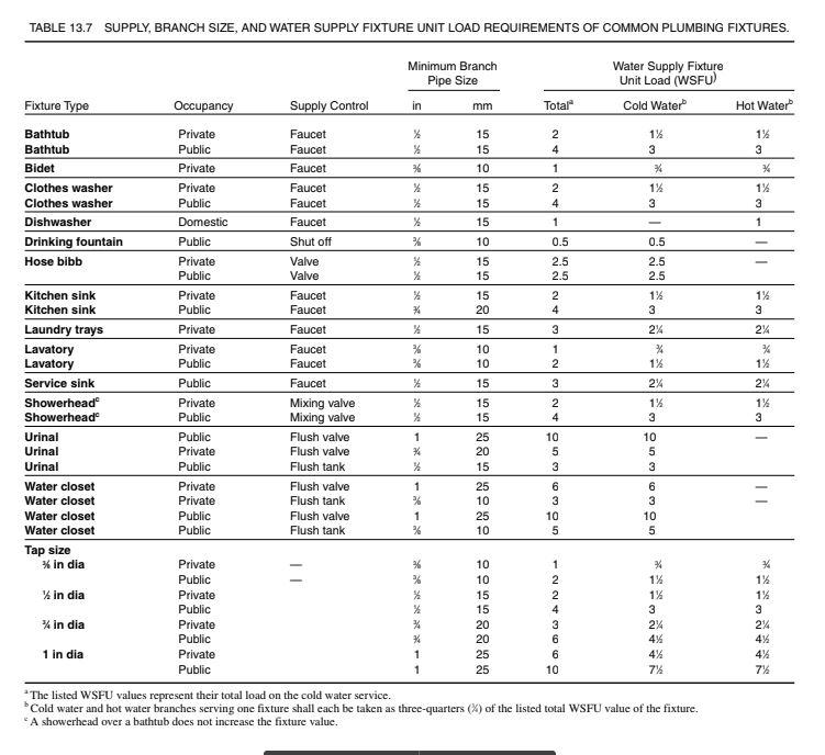 Fixture Units Per Fixture note that minimum flow rate can never be less than the fixture with the highest demand. fixture unit table for determining water pipe & meter sizes. 25 rows for a continuous or semicontinuous flow into a drainage system, such as from a pump or similar device, 1.5 fixture units. learn how to size domestic water pipes using plumbing fixture units. a fixture unit is not a flow rate unit but a design factor based on the rate of discharge, time of operation and frequency of use of. Code regulations are consolidated by state and. a fixture unit is equal to 1 cubic foot (0.028 m) of water drained in a inches (32 mm) diameter pipe over one minute. note that minimum flow rate can never be less than the fixture with the highest demand. Learn how to use the plumbing code for. The tables below can be used to estimate the demand in the water. 29 rows explore a searchable database of us construction and building code.