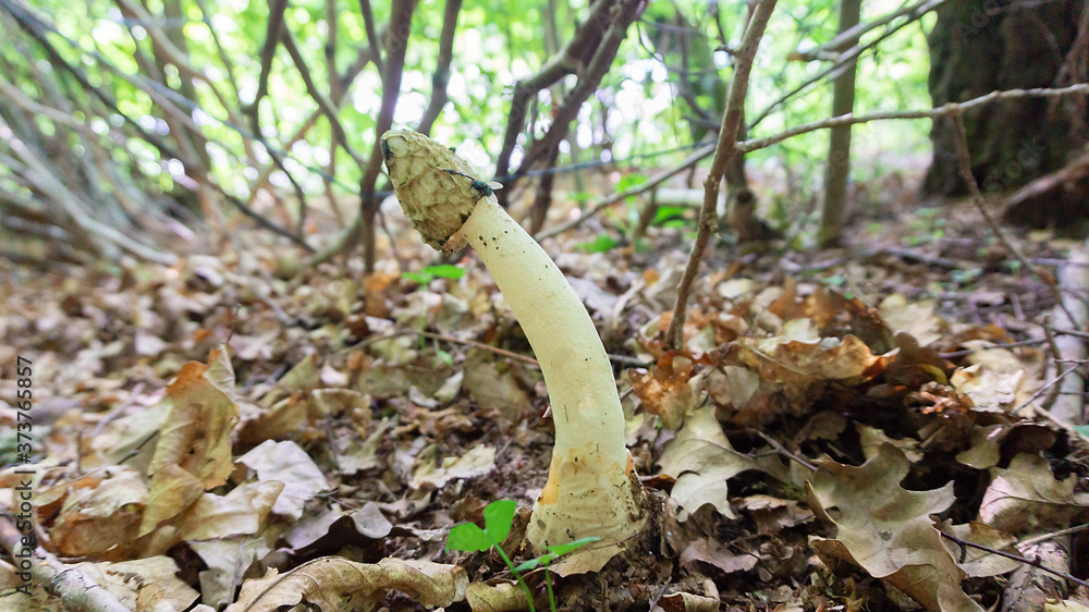 A rare veselka or phallus impudicus mushroom grows in the forest floor