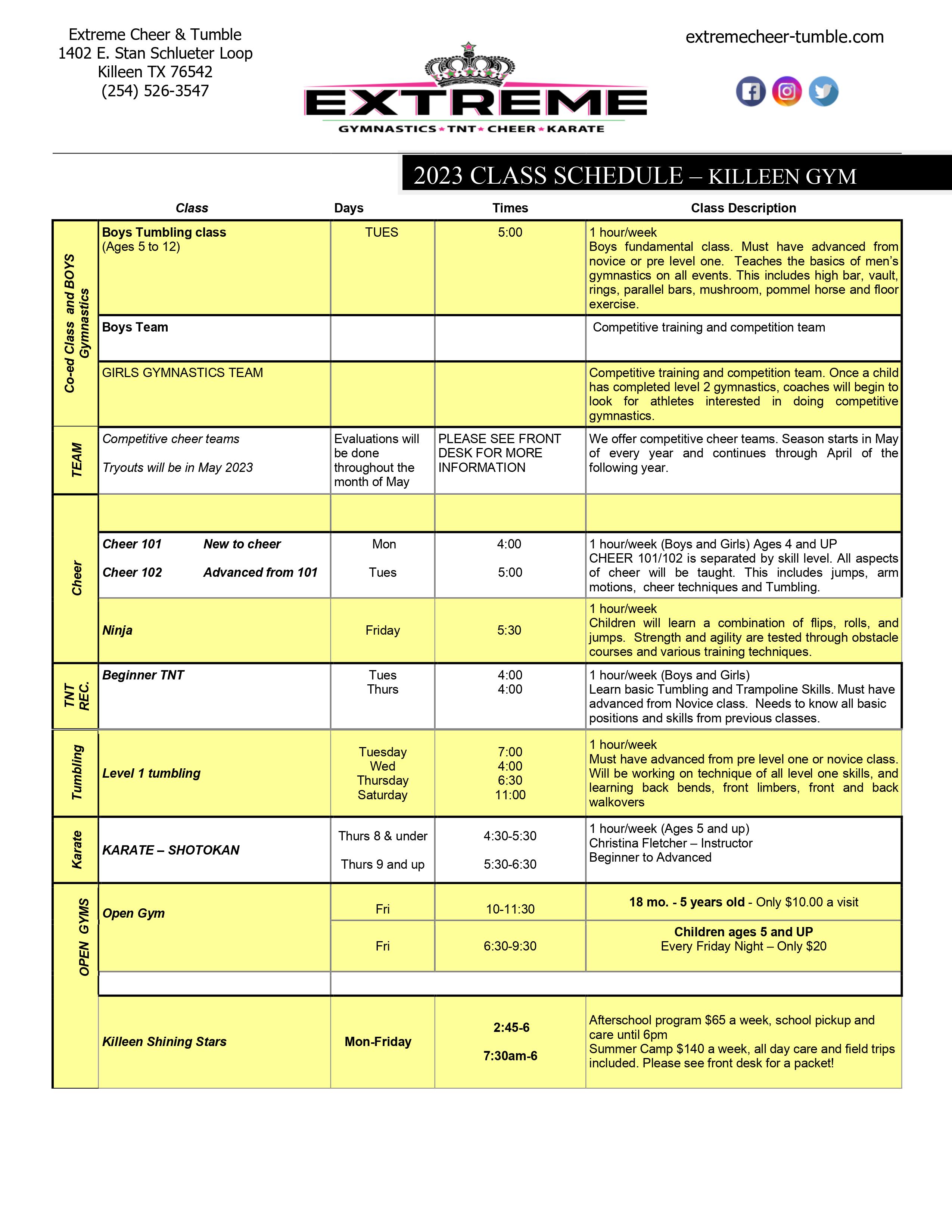 Class Schedule Killeen Extreme Cheer & Tumble