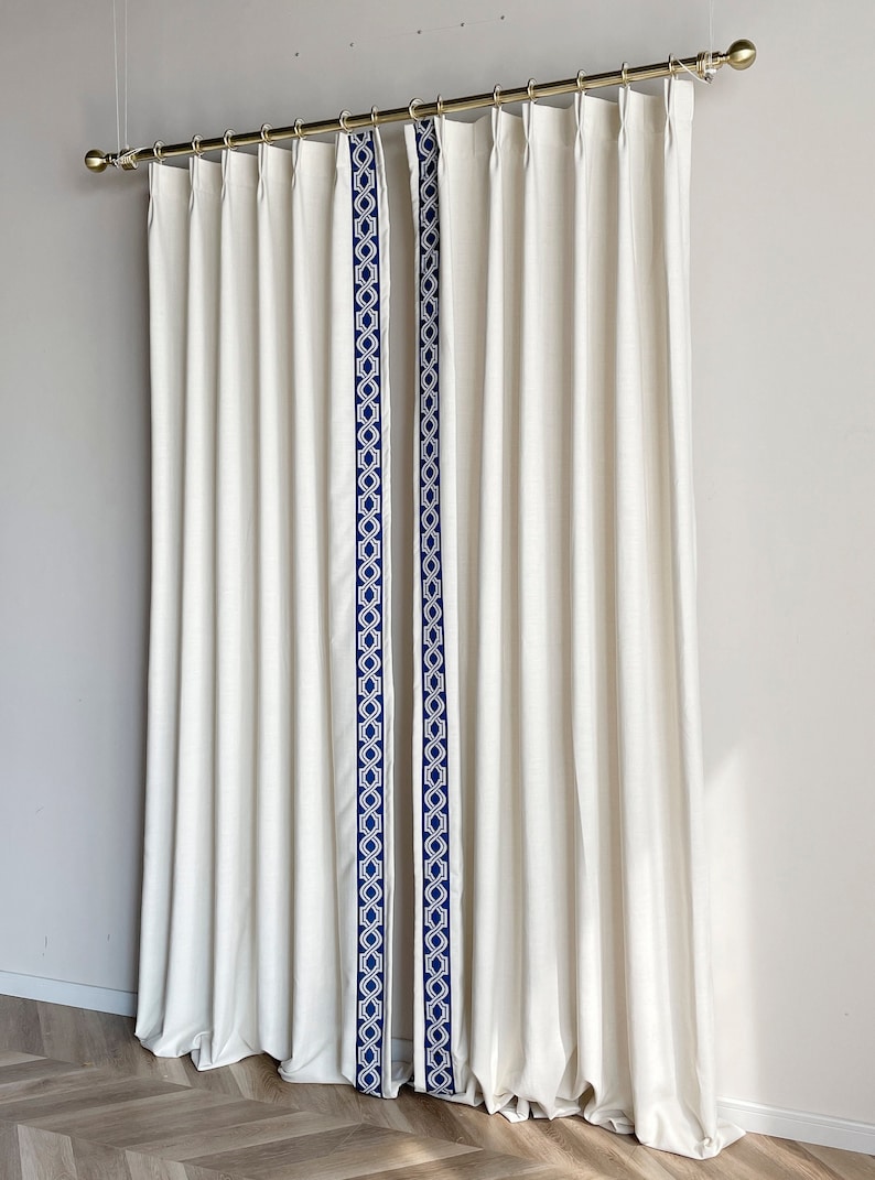 White Cotton Linen Curtain Panels With Trims Beautiful Custom Etsy