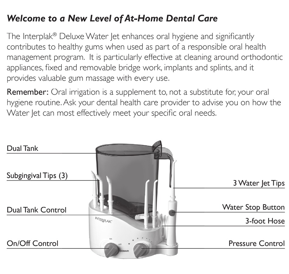 Conair Interplak Dental Water Jet and Tips 1 Kit Conair Interplak Dental Water Jet Manual visit us at our website www.interplak.com instruction manual. view the manual for the conair interplak wj3cs here, for free. t he interplak® by conair® dental water jet is a personal care unit and is intended for household use only. Interplak wj7b personal care products pdf manual download. If, in the course of use, the valve (9) on. Conair Interplak Dental Water Jet Manual.