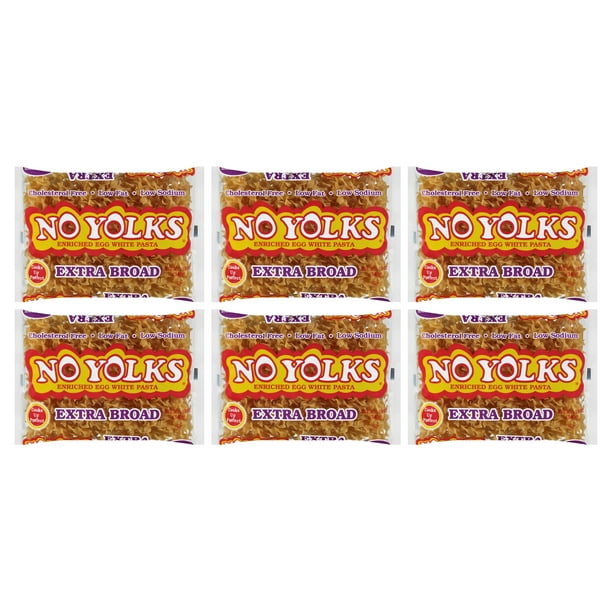 (6 pack) No Yolks Extra Broad Egg White Noodles, 12 ounce bag No Yolks Extra Broad Egg Noodles Nutrition Facts The % daily value (dv) tells you how much a nutrient in a serving of food contributes to a daily diet. Calories and other nutrition information for egg white pasta, extra broad from no yolks Personalized health review for no yolks noodles, extra broad: No yolks offers extra broad noodles that are 1/2 wide and suitable for casseroles. 2000 calories. No Yolks Extra Broad Egg Noodles Nutrition Facts.