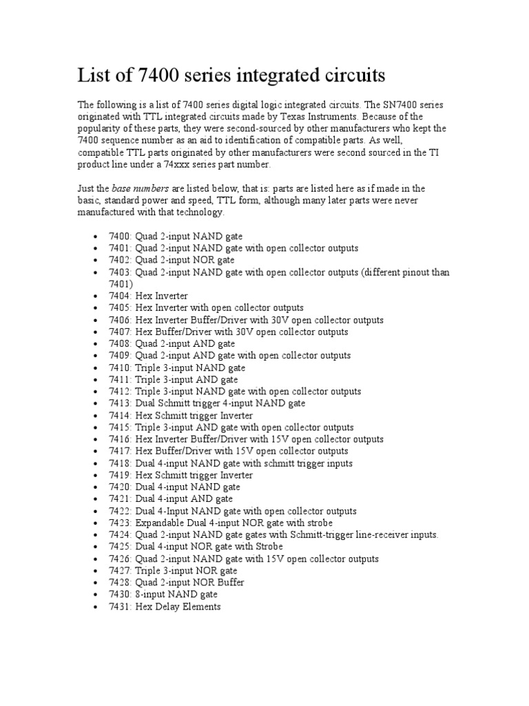 List of 7400 Series Integrated Circuits2003 Computer Architecture Computer Data List Of 7400 Series Integrated Circuits The 7400 series integrated circuits were one of the most popular. The following is a list of 7400 series digital logic integrated circuits. The 7400 series originated with ttl integrated circuits made. List of 7400 series ic. This series is introduced by “texas instruments”. The sn7400 series originated with ttl integrated circuits made by texas. This document lists over 150. List Of 7400 Series Integrated Circuits.