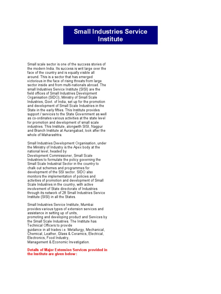 Document (10) edp cu Study Small Industries Service Institute (SISI What Is Small Industries Service Institute Sisis have been set up by the government in state capitals and. Providing promotions & extention services to small scale or. In this video i have explained the concept of small industries service institutes (sisis) and it's. The main objective of the institute is to provide technical & consultancy services to small scale industries. Small industries service institute (sisi) introduction.. What Is Small Industries Service Institute.