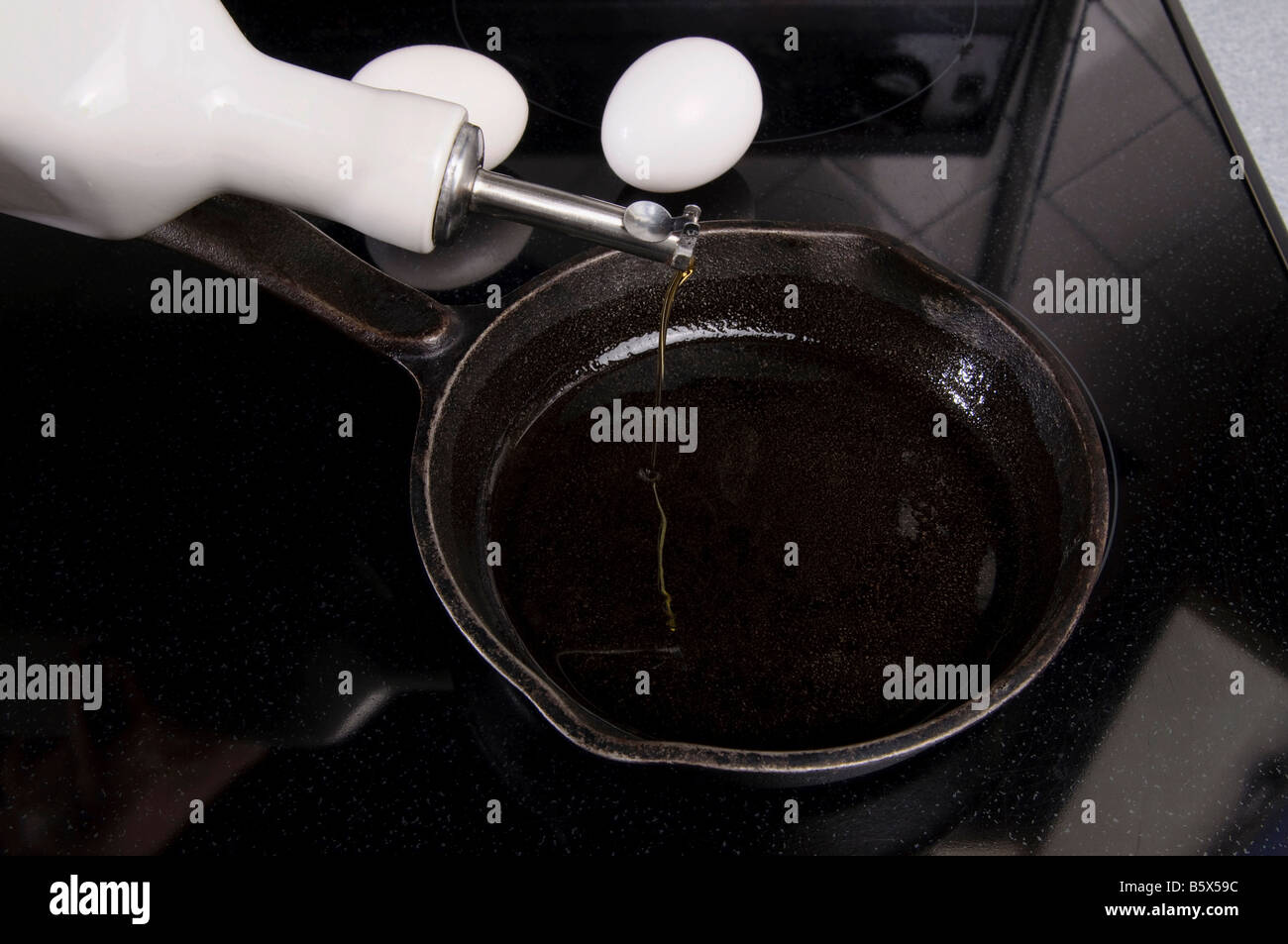 Preparing to fry eggs in olive oil Stock Photo Alamy