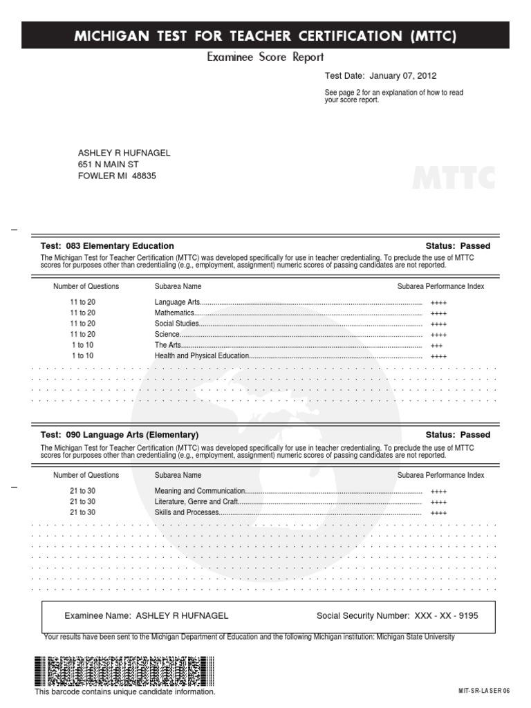 Michigan Test For Teacher Certification (Mttc) Examinee Score Report