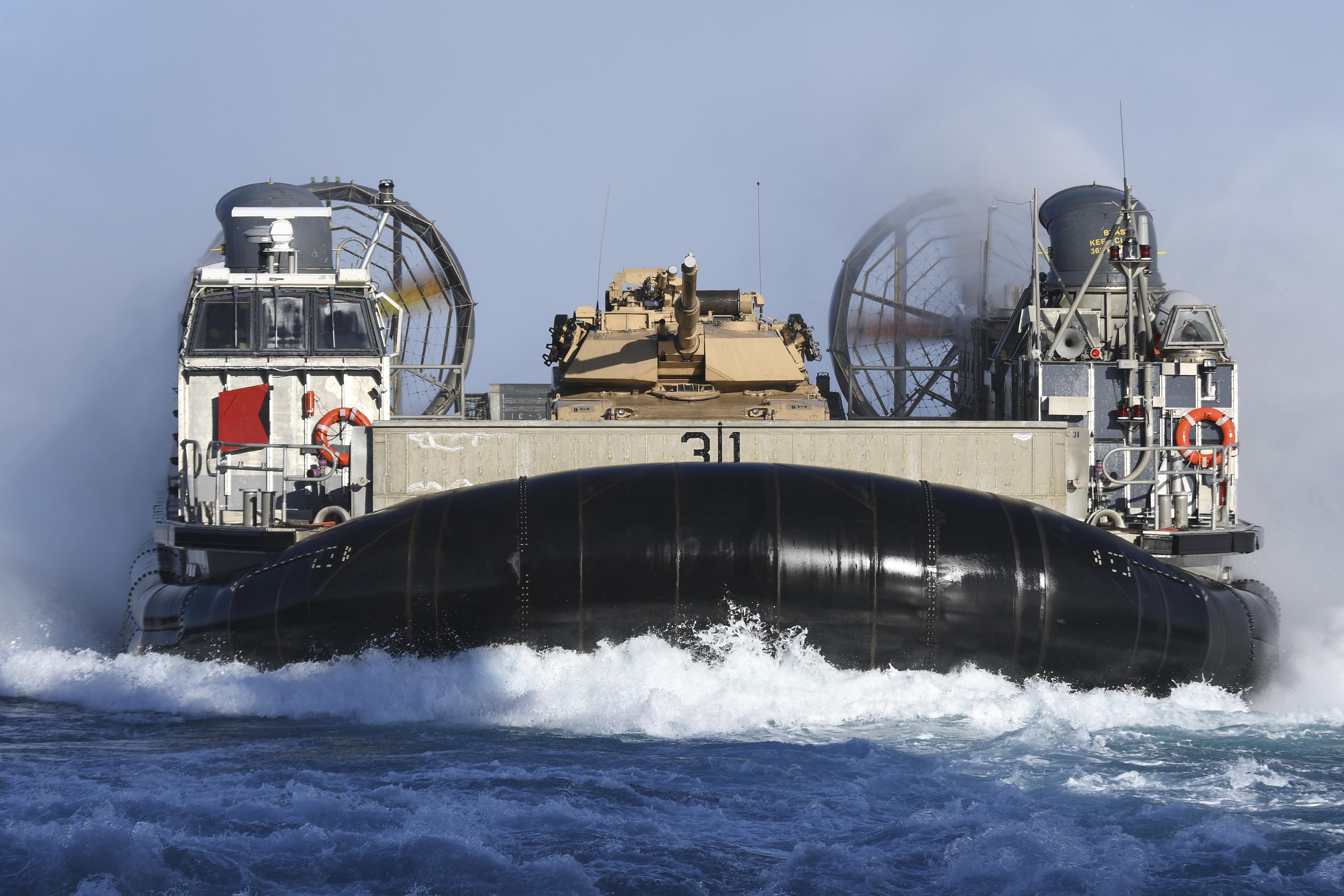 Landing Craft Air Cushion (LCAC) transporting an M1A1 Abrams approaches