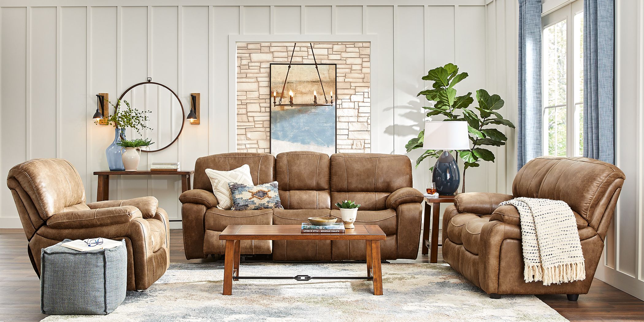Cindy Crawford Home Alpen Ridge Tan 5 Pc Living Room with Reclining Sofa Rooms To Go