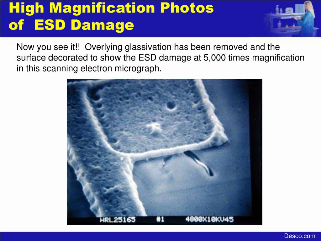 PPT High Magnification Photos of ESD Damage PowerPoint Presentation What Does Esd Damage Look Like Science tells us that esd is caused when the electrons that have built up on an object do not equal the object’s number of protons. While it is difficult to visualize exactly the nature of esd damage with only the naked eye or a magnifying glass, sem. Electric charge flows between objects with different potentials when electrostatic discharge (esd) occurs.. What Does Esd Damage Look Like.