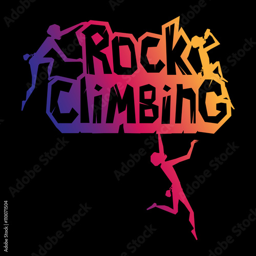Rock Climbing words on the rock with climbers in different poses. Rocky