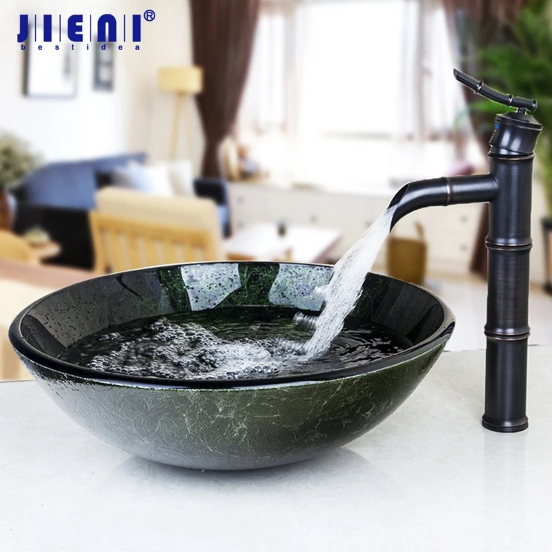 Green Stone Color Round Wash Basin Bathroom Sink Set Tempered Glass