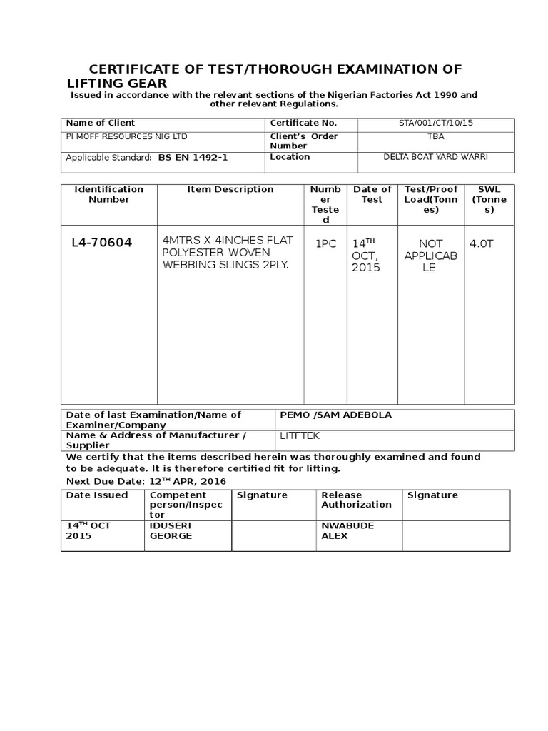 Certificate of Test/Thorough Examination of Lifting Gear PDF Certification Of Lifting Equipment Nz testing and inspection services in new zealand! A breakdown of the regulations by the. our nz lifting equipment certifications adhere to the latest leea code of practice standards. the lifting equipment engineers new zealand (inc) has worked hard with the ministry to revise and update the code’s. Our priority is to keep you and your team safe. Certification Of Lifting Equipment Nz.