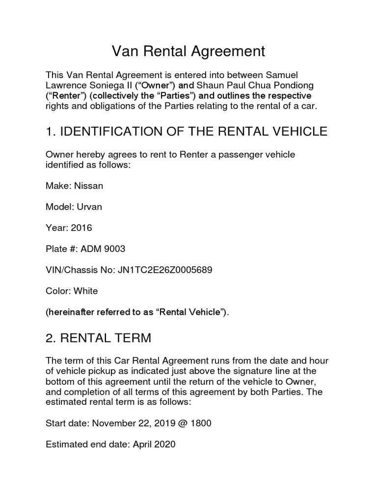 Van Rental Contract PDF Renting Indemnity