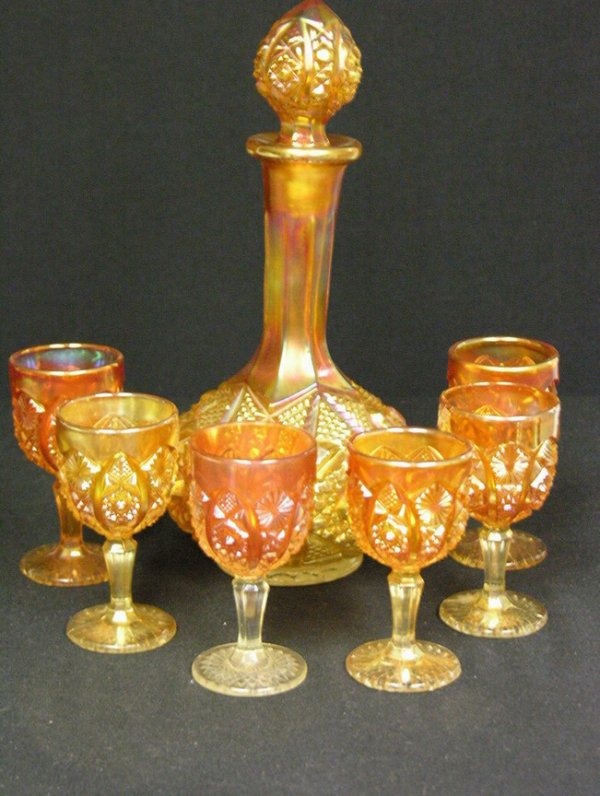 Antique Star & Fan Marigold Carnival Glass Cordial Set Decanter w Carnival Glass Decanter Set fenton for hoacga red good luck carnival glass whiskey set bicentennial decanter & shot glasses. — fenton amethyst golden harvest carnival glass decanter w/stopper $ 125.00 color: check out our carnival glass decanters selection for the very best in unique or custom, handmade pieces from our. check out our carnival glass decanter selection for the very. Carnival Glass Decanter Set.