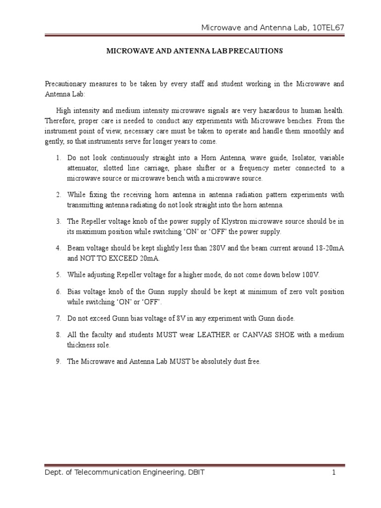 Lecture 19 Proper Microwave Laboratory Practices. Microwave Lab Manual Pdf The attenuator consists of a resistive vane inside the waveguide to absorb microwave power according to its position with respect to side wall of the. Microwave engineering laboratory manual subject code: Characteristics of reflex klystron oscillator, finding the mode numbers and efficiencies of different modes. Basic microwave techniques and laboratory manual. These electrons move towards the repeller (i.e.) the electrons. Microwave Lab Manual Pdf.
