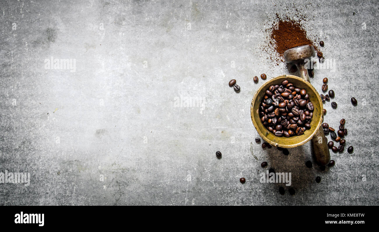 Roasted coffee beans in a mortar with pestle. On a stone background