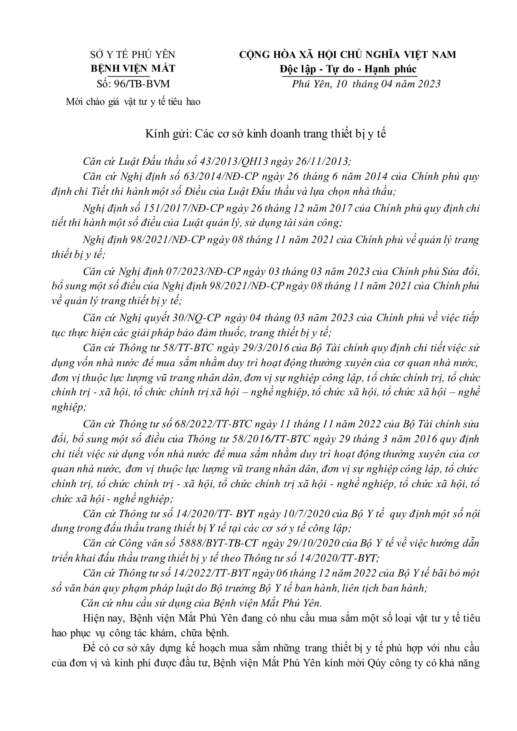 thống báo mời chào giá vtyt khác