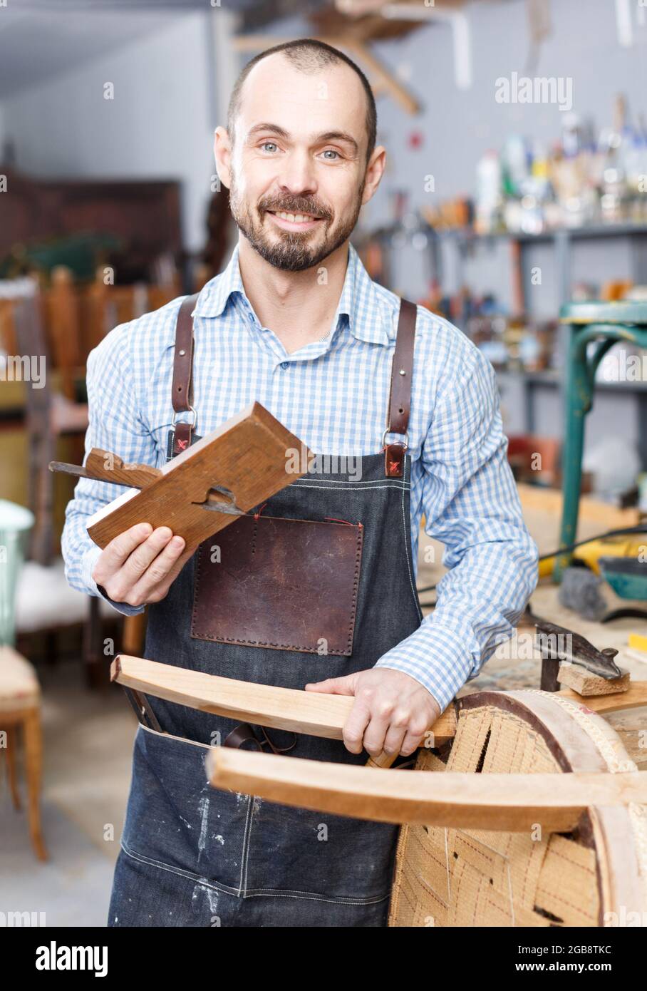 Restorer holding tools in woodwork studio Stock Photo Alamy