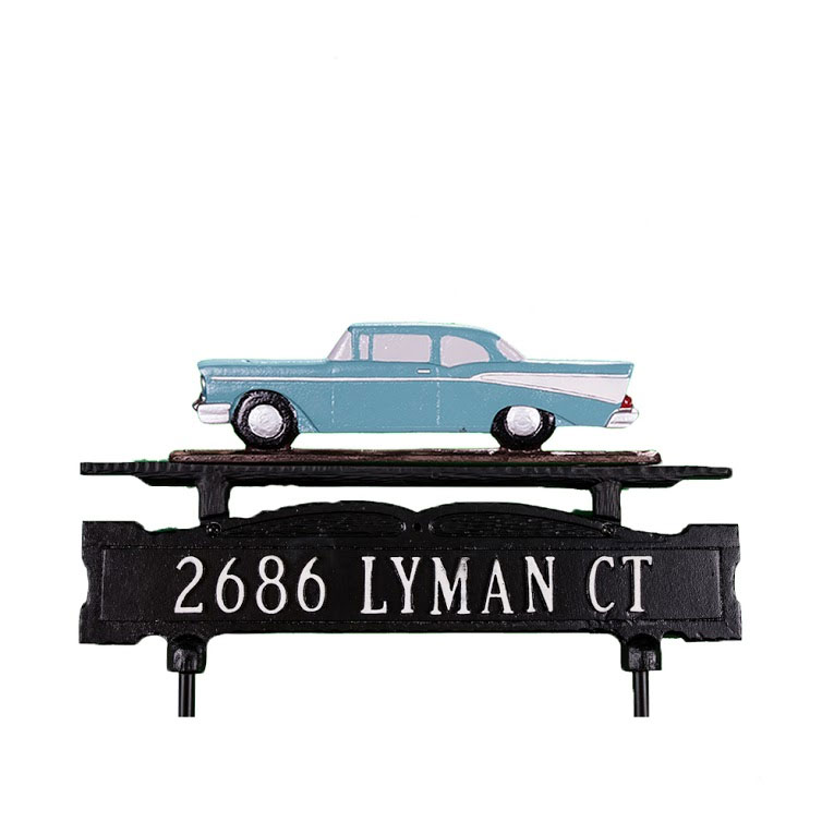 Lawn Address Sign With Classic Car Ornament On Top Double Sided