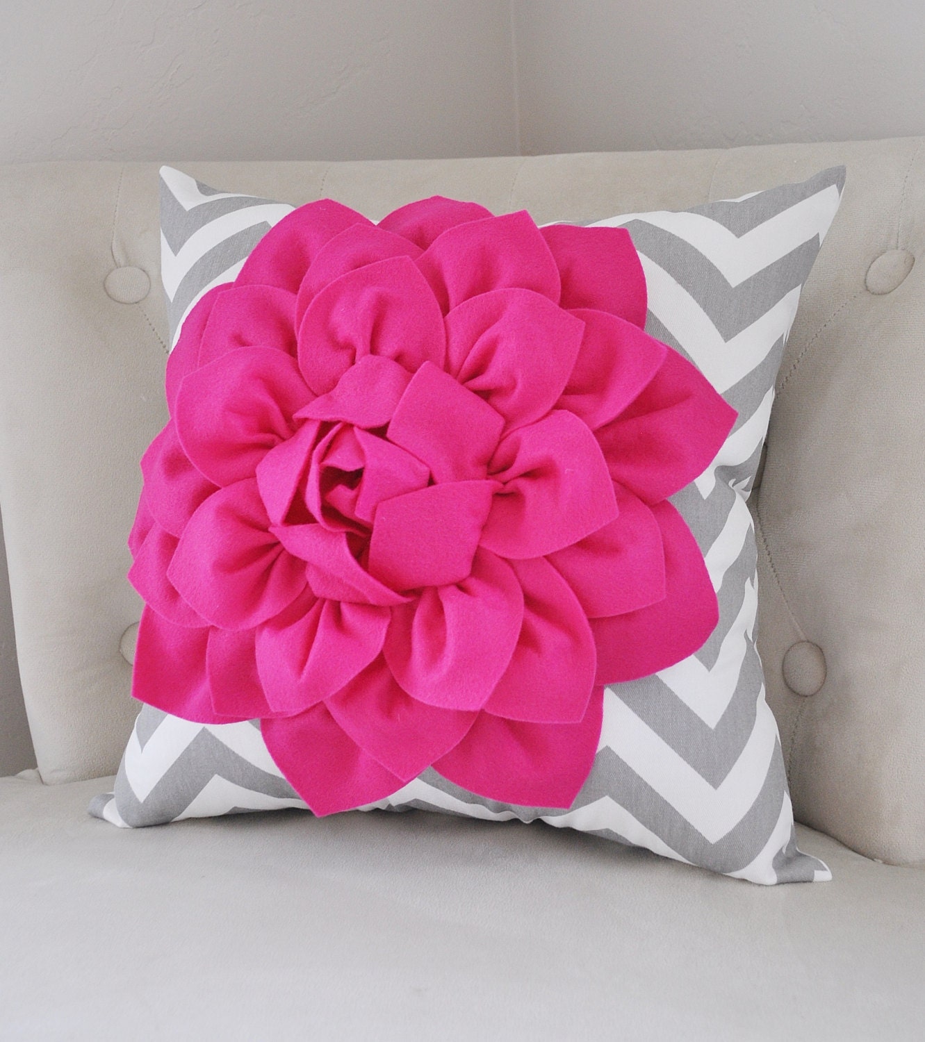 PILLOWS Hot Pink Dahlia on Gray and White Zigzag Pillow Hot