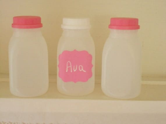 Plastic Milk bottles kids parties pink white by Pinkrosecottage