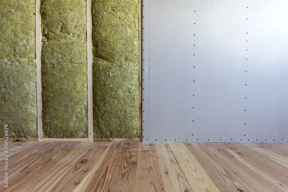 Wooden frame for future walls with drywall plates insulated with rock