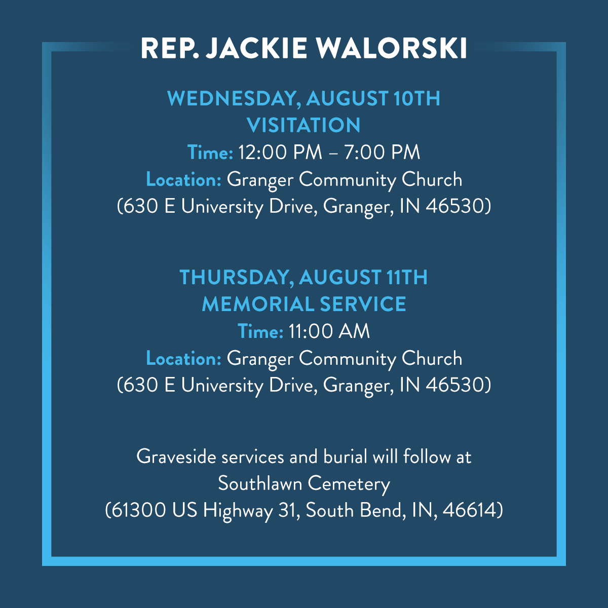 Funeral arrangements announced for Rep. Jackie Walorski WOWO News/Talk 92.3 FM, 1190 AM, 107.5 Funeral Arrangements Jackie Walorski Jackie walorski, republican congresswoman for district 2 in indiana, died today in a car crash at the age of 58. Indiana congresswoman jackie walorski, two of her staffers and a fourth person were killed in a crash wednesday. The funeral service for us rep. Visitation will be on wednesday, august 10th from 12 p.m. Funeral arrangements for jackie walorski have. Funeral Arrangements Jackie Walorski.