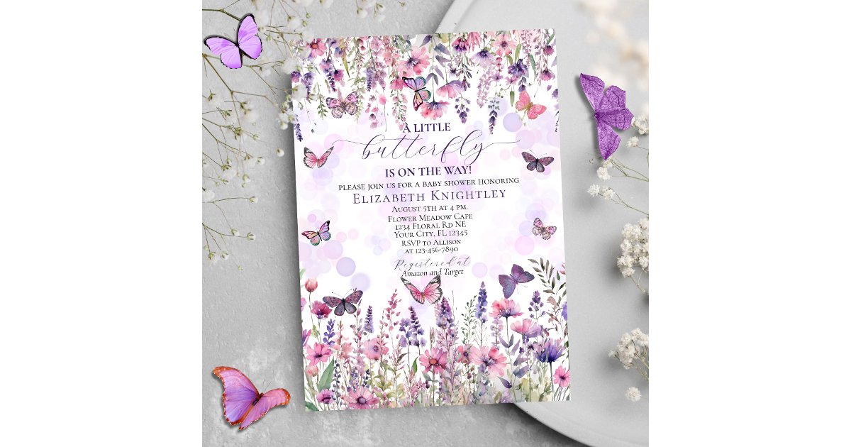 Purple Pink Butterflies & Wildflowers Baby Shower Einladung Zazzle.de