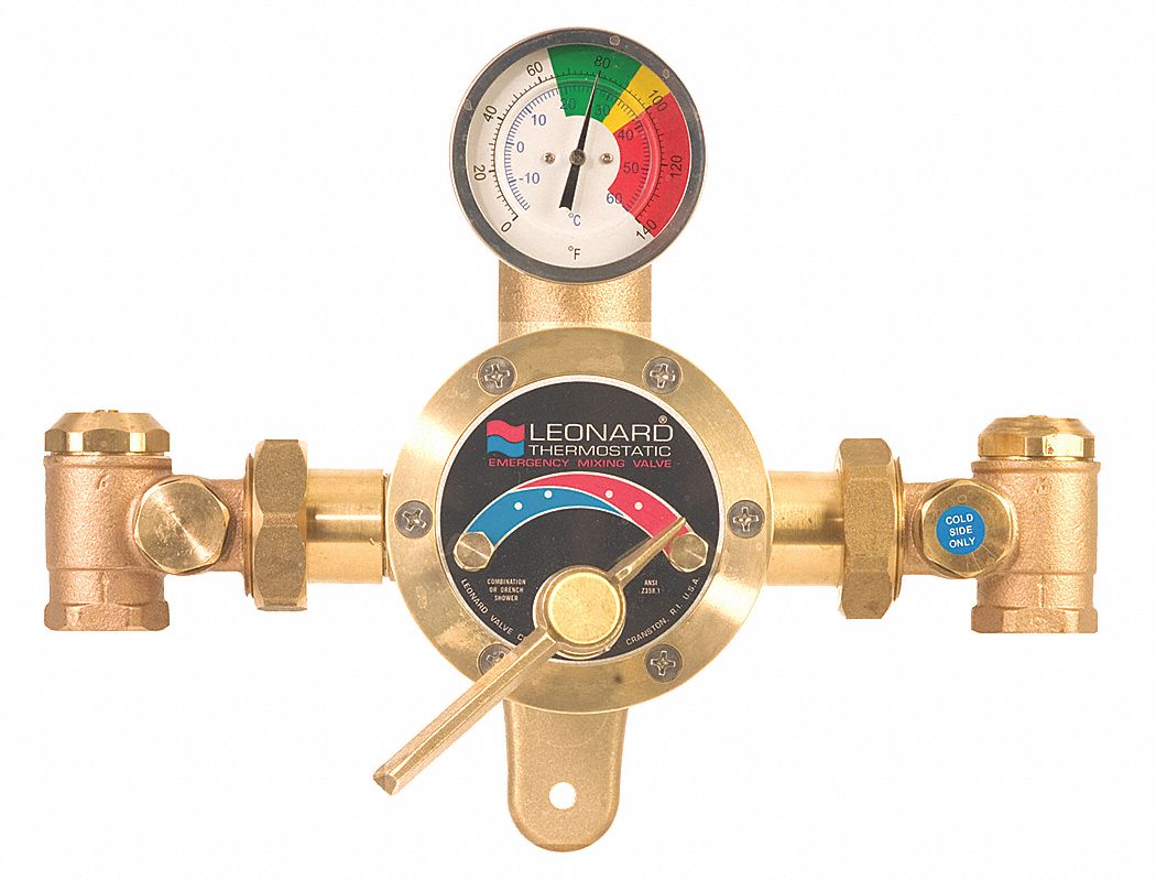 LEONARD VALVE Emergency Mixing Valve, Inlet Size 1 in, For Use With Mixing Valve For Safety Shower The thermostatic mixing valve delivers a steady temperature despite varying. Model 9201e emergency mixing valve (patent pending) thermostatically mixes hot and cold water to provide a safe fluid supply for emergency showers and eyewash equipment. Guardian g3707lf 34 gallon capacity thermostatic mixing valve in a recess mounted stainless steel cabinet with tag showing asse 1071 compliance. Featuring a 38.0 gpm. Mixing Valve For Safety Shower.