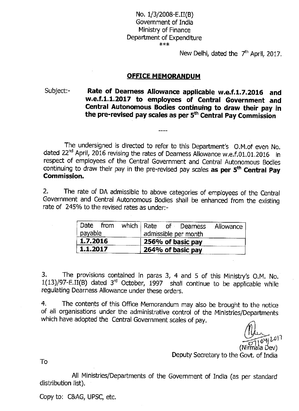 5th CPC Dearness Allowance from July, 2016 256 and Jan, 2017 264