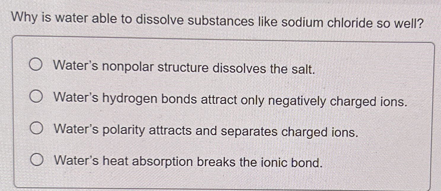 Solved Why is water able to dissolve substances like sodium