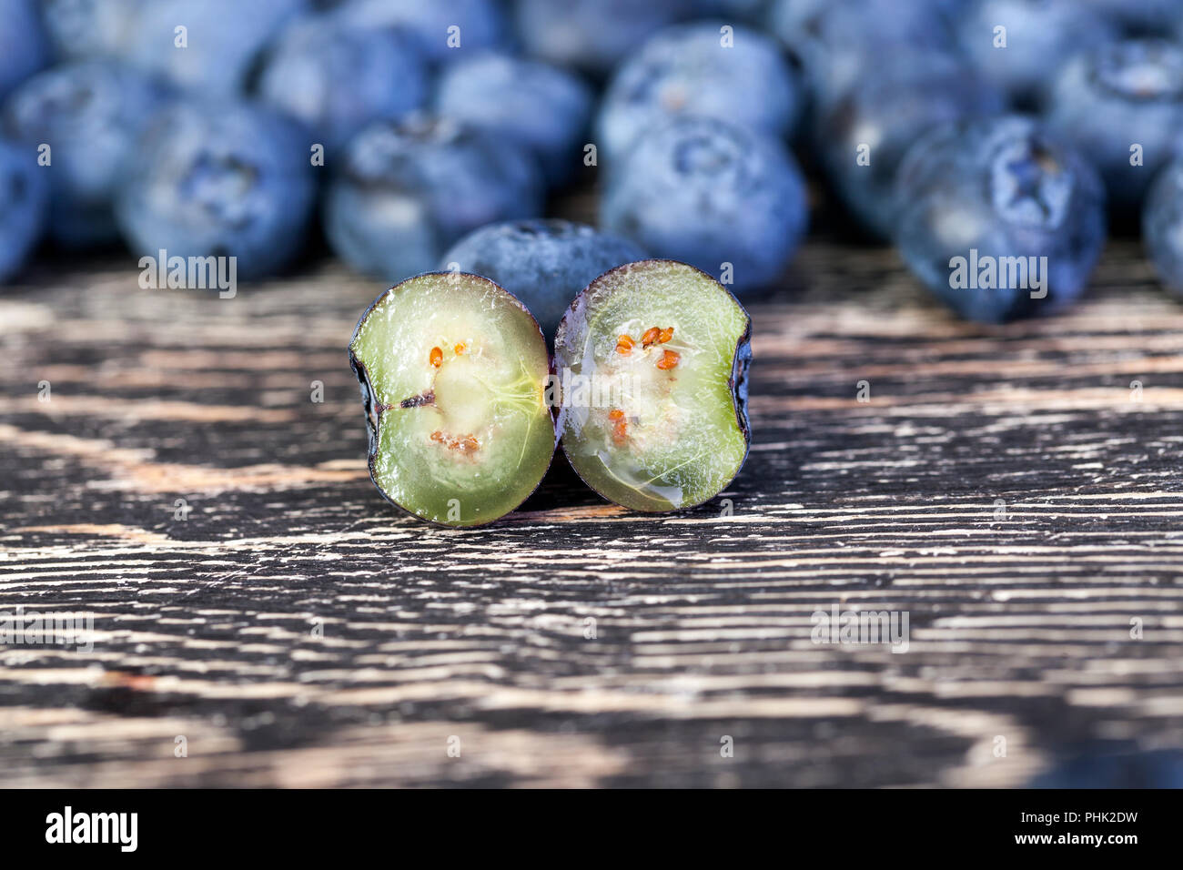 fresh sweet blueberries, one berry cut in half and visible flesh with