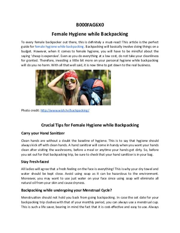 (DOC) B000FAG6X0 Female Hygiene while Backpacking Hiking Gear Lab Female Hygiene While Backpacking A female should develop a plan to maintain their hygiene in the backcountry before the trip begins. In this respect, it’s no different than the food you’ll eat, the shelter you’ll use, and the routes you’ll follow — it usually works out better to plan it than to wing it. But add a period into the mix? Hygiene while backpacking. Female Hygiene While Backpacking.