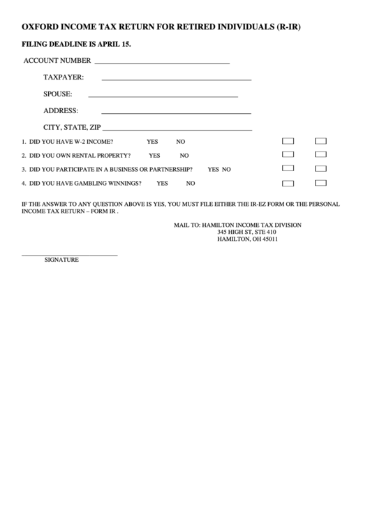 Form RIr Oxford Tax Return For Retired Individuals printable