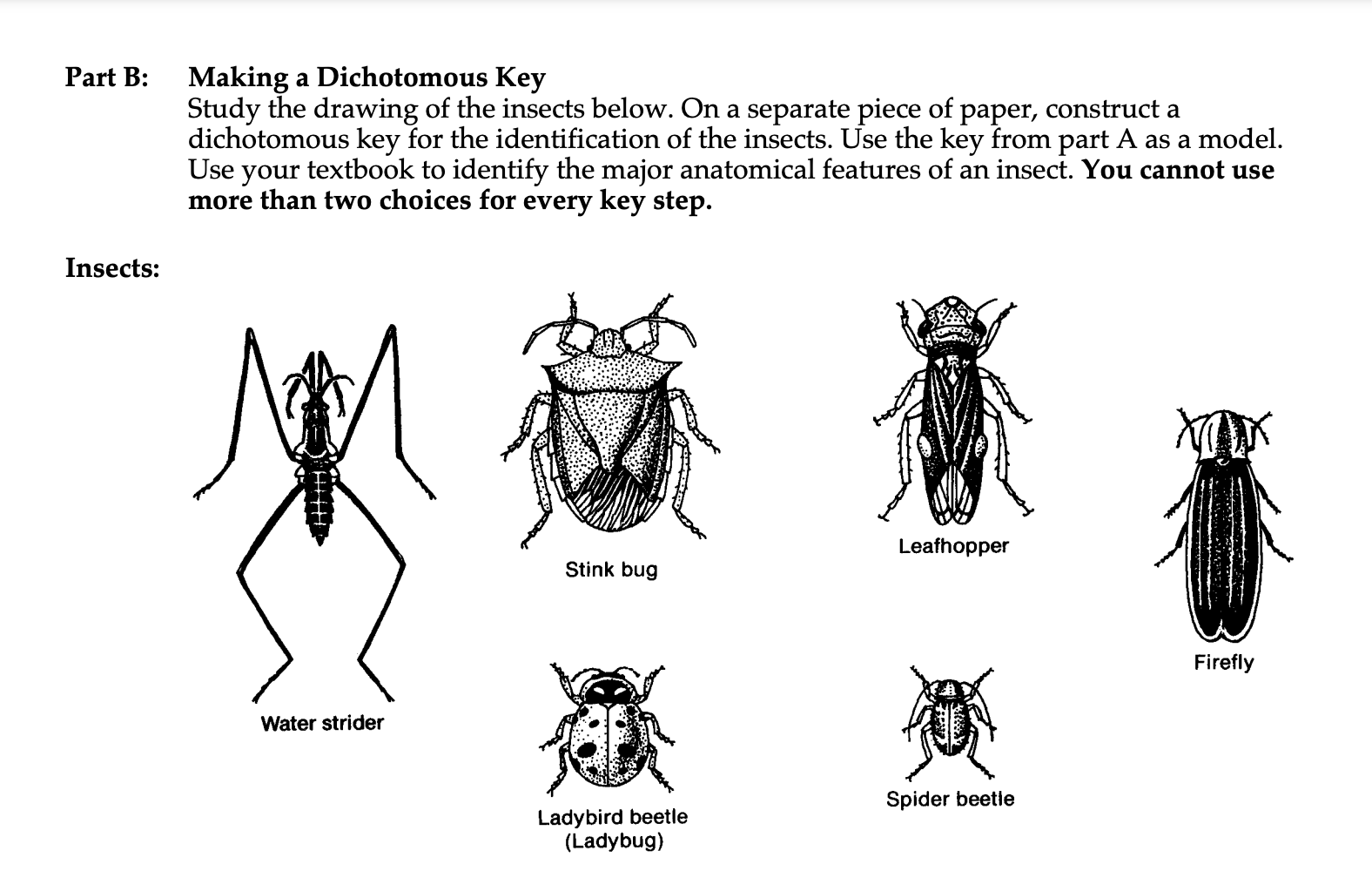 Solved Part B Making a Dichotomous Key Study the drawing of Dichotomous Key For Insects Answers Our two point insect dichotomous key can assist in identifying. A dichotomous key is used to help identify unknown living things. Study with quizlet and memorize flashcards containing terms like hymenoptera, isoptera, collembola and more. Arthropods with six legs, with tiny or missing wings. In biological sciences a “key” is a written tool used to. Begin by determining if the. Dichotomous Key For Insects Answers.